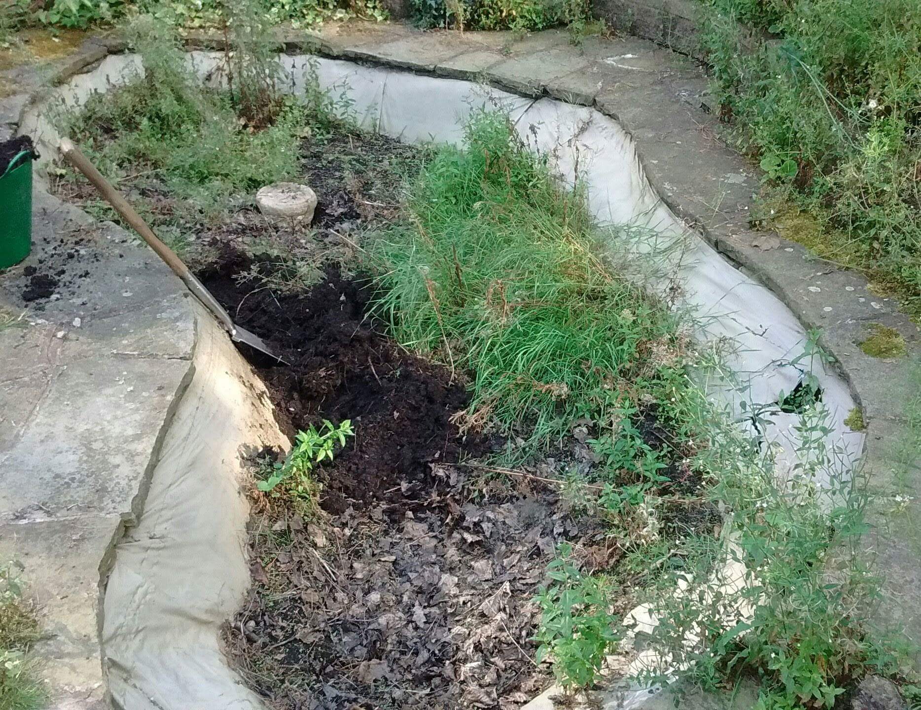 Soil dug out to set the levels of the pond, a deep end, a shallow plateau and a marginal shelf. Paving flags lifted to accommodate the new liner.