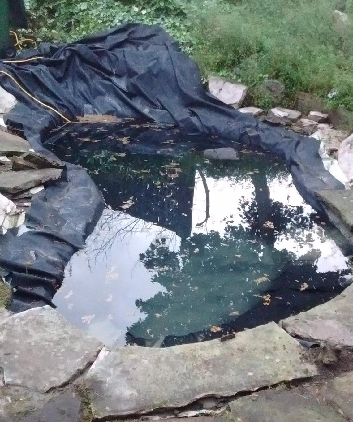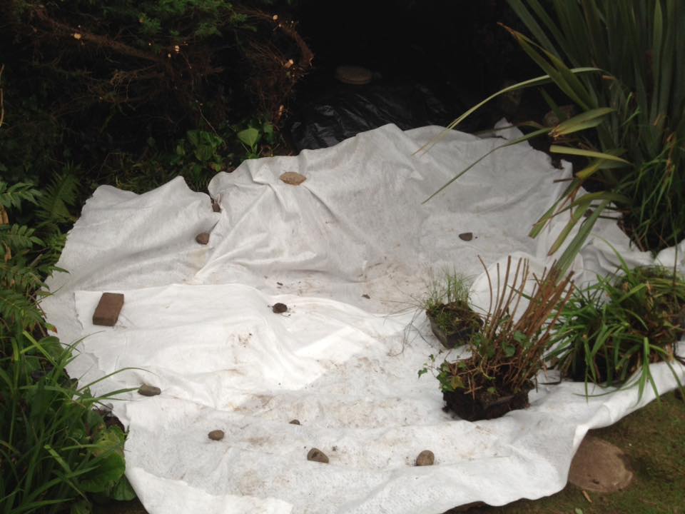 The remains of an old pond partly filled in. Old liner is torn and needed replacing.
