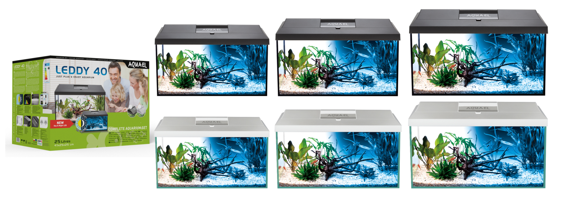 AQUAEL LEDDY sets are available in three sizes: 40, 60, and 75 cm.